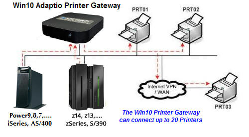 "Remote Out Queue" LAN printing. The Win10 Adaptio Gateway provides bi-directional communication between the printer and the