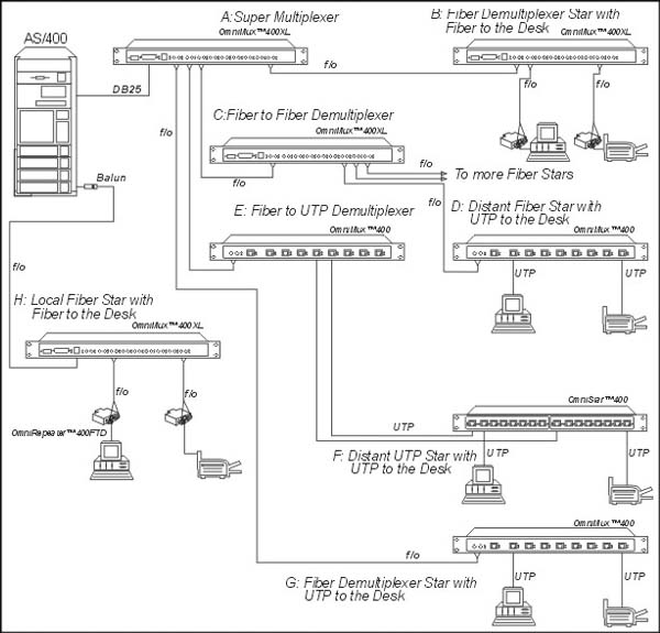 to each device via a fiber converter such as the OmniRepeaterTM 400FTD.
